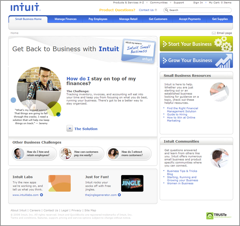 I was asked to redesign Intuit.com's homepage user experience. Some of the goals for this page were to make it informal, and welcoming, emphasize their small business prioritization, and to bring a new social-media experience. I also extensively reworked Intuit.com's information hierarchy and navigation.